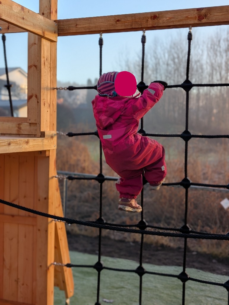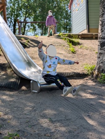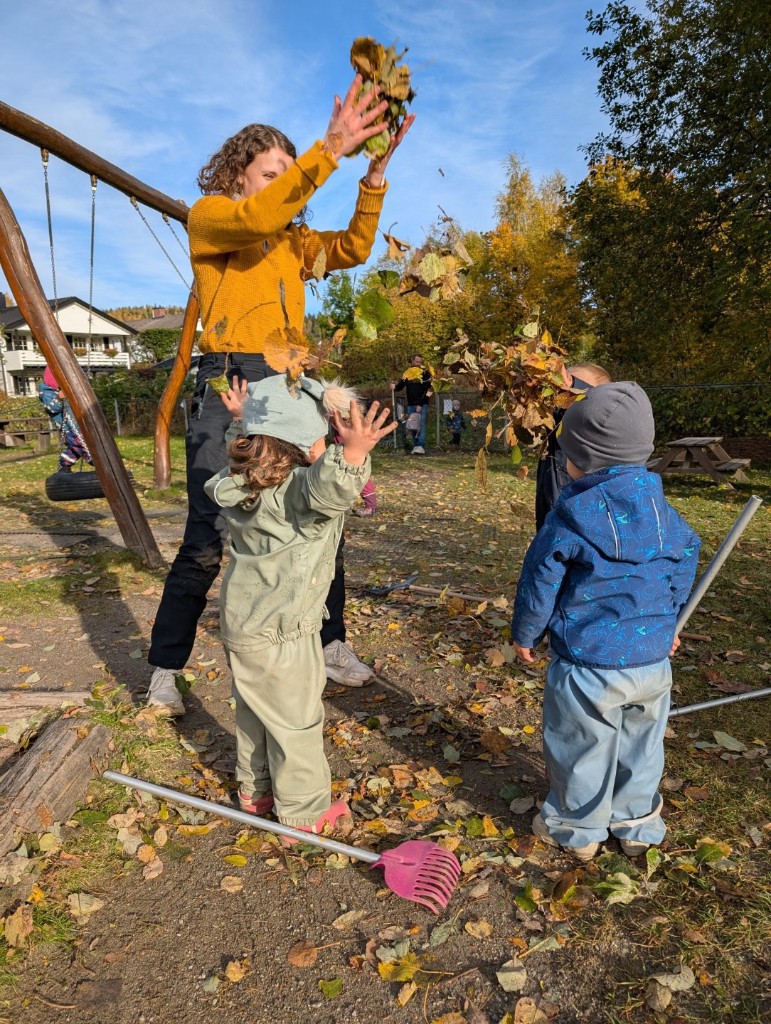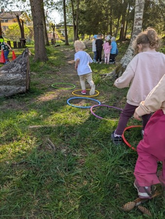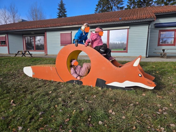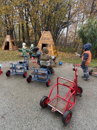 Uterommet vårt består av store naturlige områder med skog, skråninger, gressområder, en åpen gresslette, et asfaltert område og en kjøkkenhage med frukttrær og bærbusker. I tillegg oppgraderte vi utelekeplassen vår høsten 2025 med mange nye og flotte lekeapparater som barna leker i, boltrer på og utforsker. Alle de ulike lekesonene våre gir spennende motoriske utfordringer samt store muligheter for lek med ball, og asfalten passer perfekt til for eksempel sykling, løping, tegning med kritt eller sprette ball.