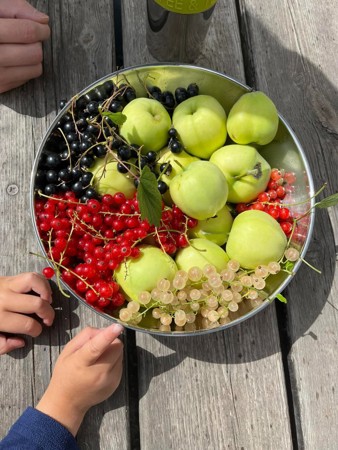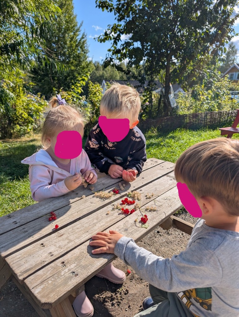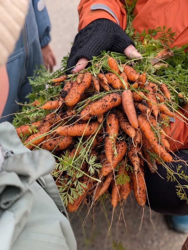 Om våren er barna med på å plante grønnsaker, urter og andre spiselige vekster i grønnsakshagen vår. Vi har også settebøtter til poteter, epletre og rips-, stikkelsbær-, og solbærbusker. Rundt omkring står det velduftende urter som sitronmelisse og gressløk i store blomsterpotter, og vi har flere bedd med blant annet sukkererter. Det er stor stas å få være med på hele prosessen fra frø til spiselige frukter i løpet av året. Om sommeren koser vi oss med selvplukk av bær fra de bugnende bærbuskene.