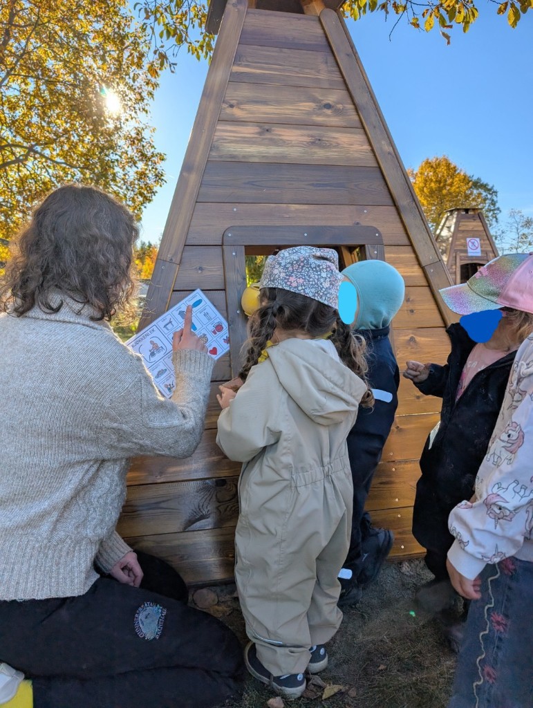 Vi har også flere referanseområder utenfor gjerdene. Særlig er vi stolte av gapahuken vår – her har personalet fått veiledning og kurs i å lage vår egen naturlekeplass! Les mer om gapahuken under fanen «avdelingene».
